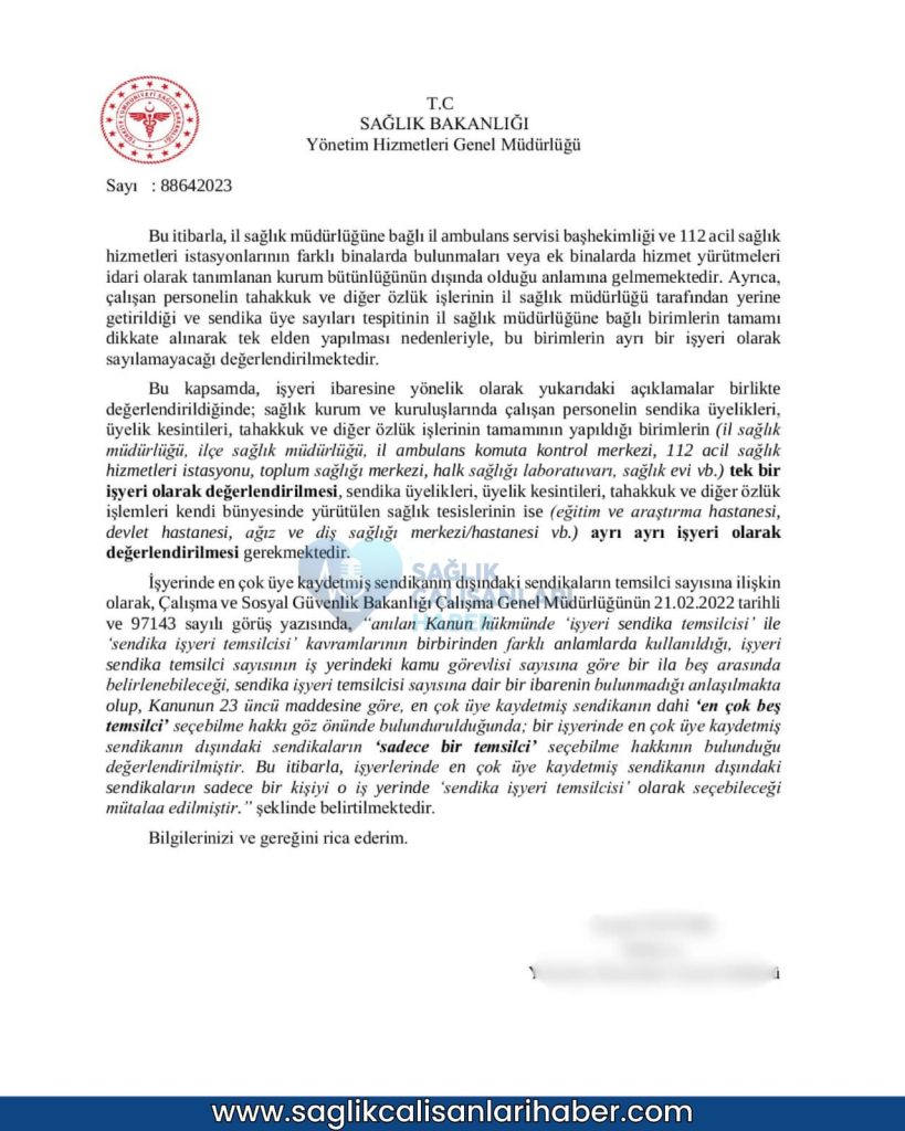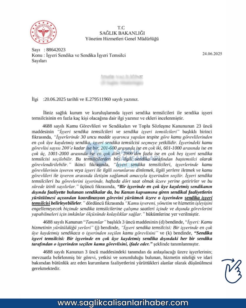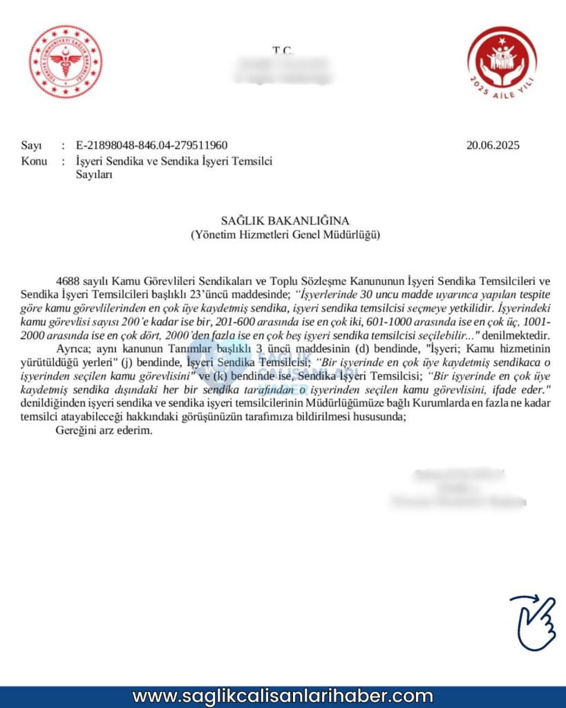 Sağlık Bakanlığı’nın gönderdiği resmi yazıyla yeniden gündeme gelen sendika temsilciliği uygulaması, sağlık çalışanları arasında ciddi tartışmalara yol açtı. Yazıda, 4688 sayılı Kamu Görevlileri Sendikaları ve Toplu Sözleşme Kanunu’na atıf yapılarak, en çok üyeye sahip sendikanın 1 ila 5 temsilci belirleyebileceği, diğer sendikaların ise yalnızca bir temsilciyle sınırlı tutulacağı belirtildi.